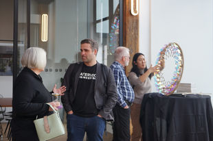 KONA consists of an eight-foot CNC-milled circular frame with a series of internal plywood hinges. Lightweight iridescent vinyl modules are attached to the hinges and fold in response to their movement, enhancing lighting effects and visual depth.